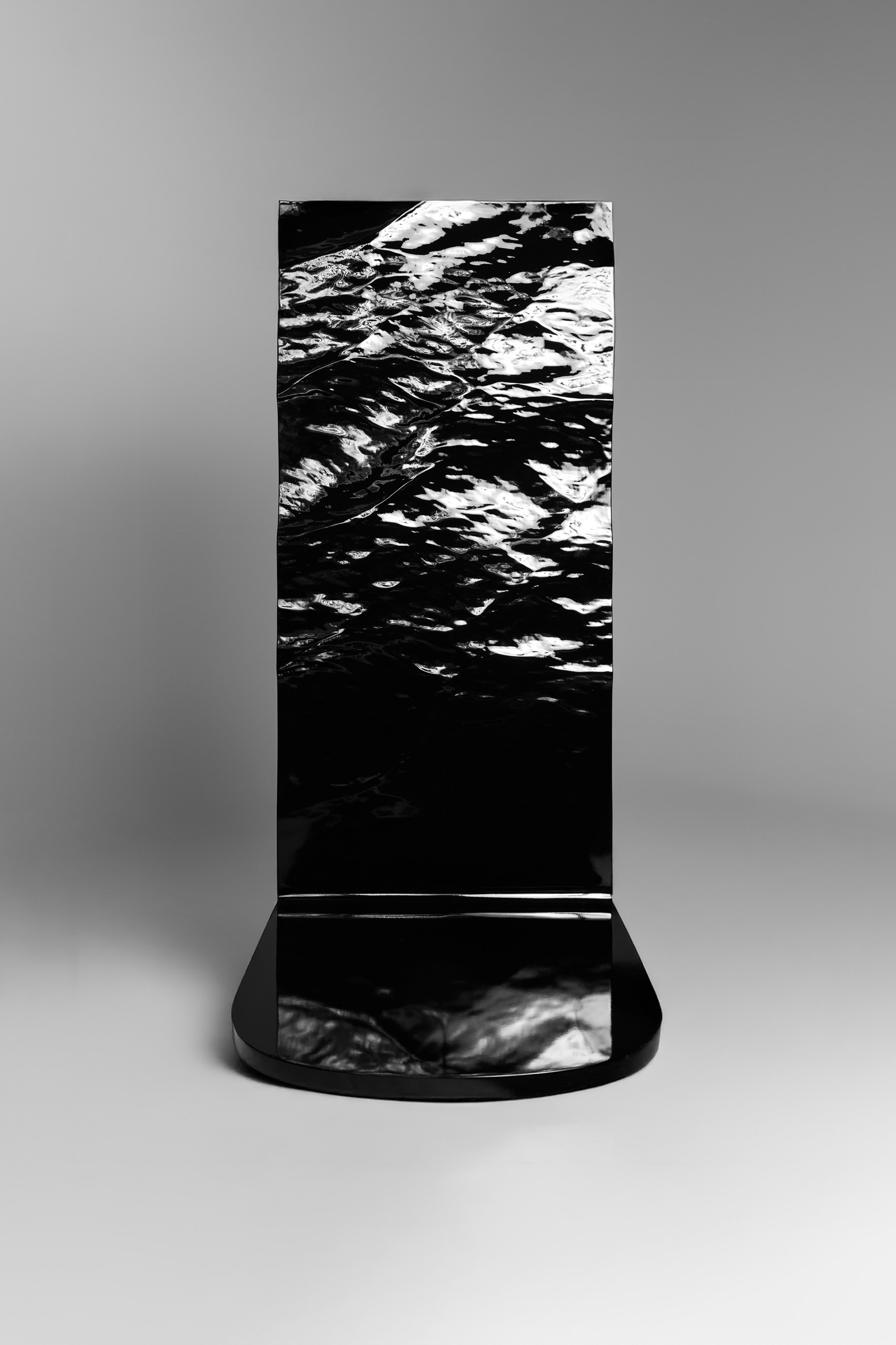 Conceived as a wall-anchored architectural element, the piece transitions from a solid wooden surface into a reflective plane as it reaches the wall. The material appears to dissolve, evoking the presence of water through a controlled shift in surface and perception.