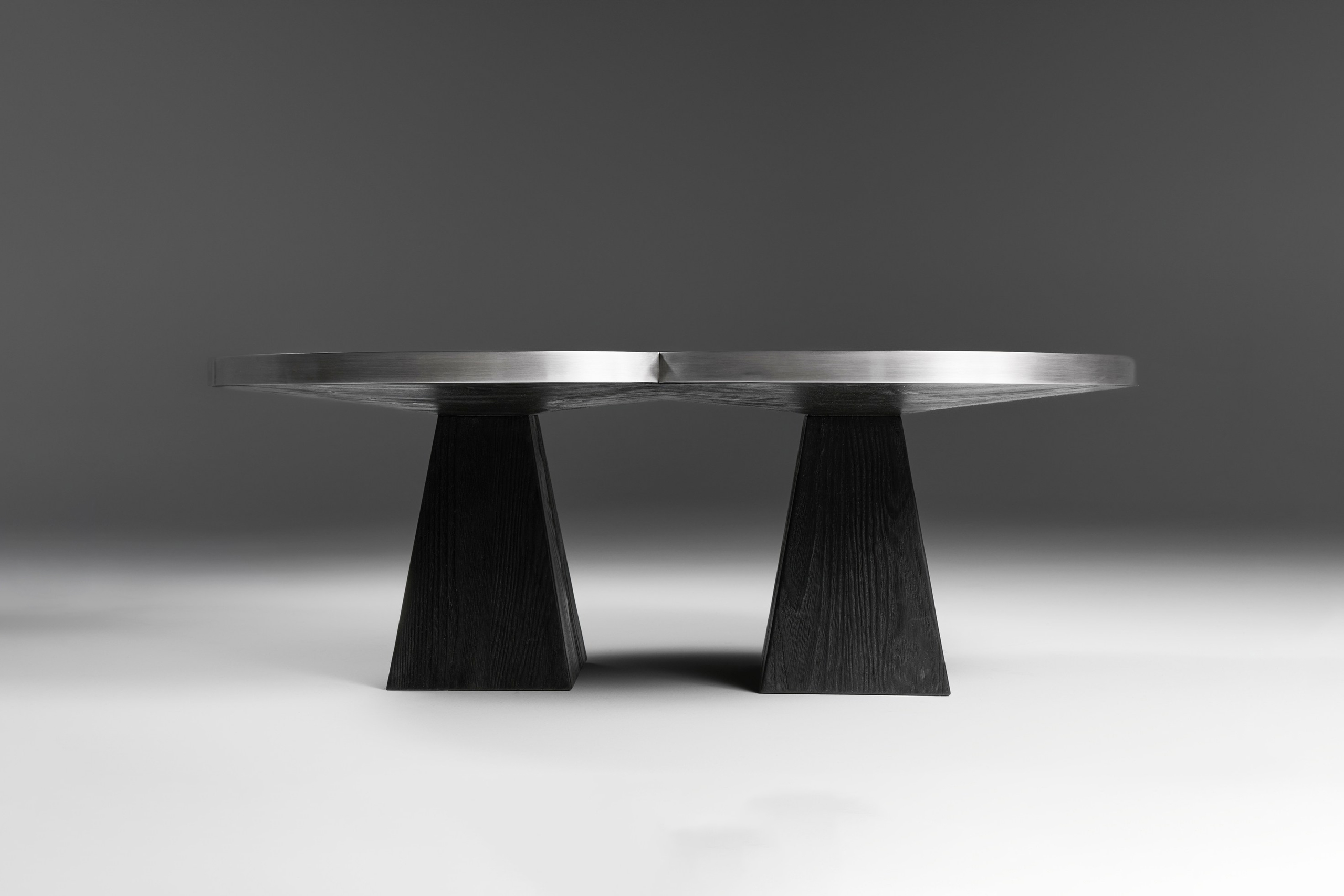 At their intersection, a mirrored surface interrupts the solidity of the piece, reflecting light and surroundings while revealing the vulnerability of what appears heavy and permanent. This moment of reflection becomes both visual and conceptual, questioning weight, balance and perception.